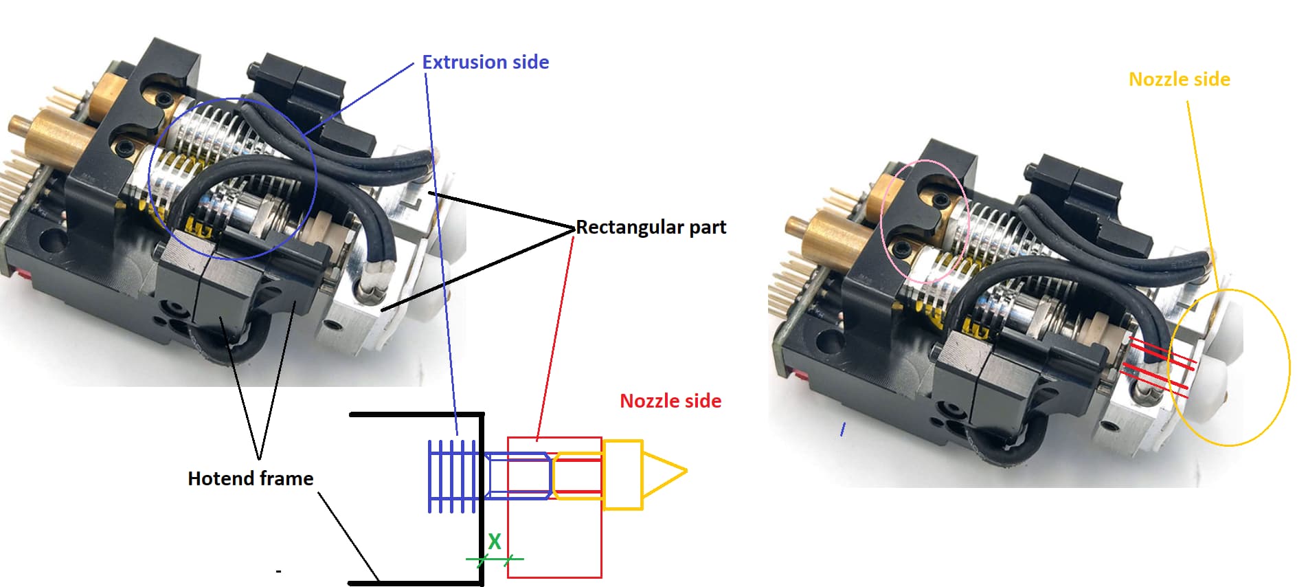 I explain better. Nozzle has a treaded part to connect to the rectangular part of the hotend. The extruson has the same treader end part and engage in the same treaded of the rectangular part, but in the other side.